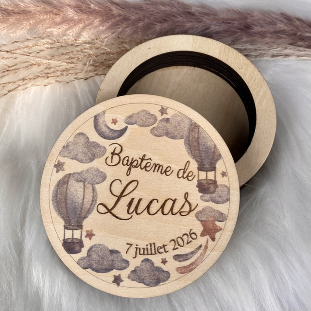 Boîte de Baptême en Bois Personnalisée – Modèle Bébé, Colombe ou Montgolfière