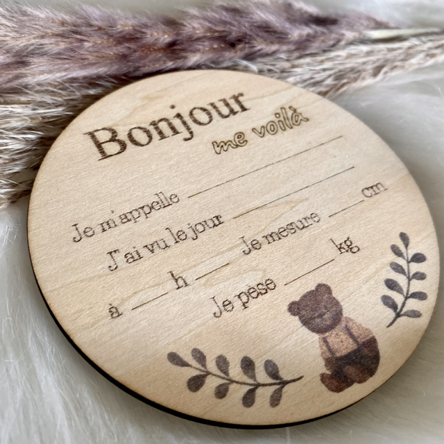 Carte de naissance en bois à remplir - Modèle Bonjour