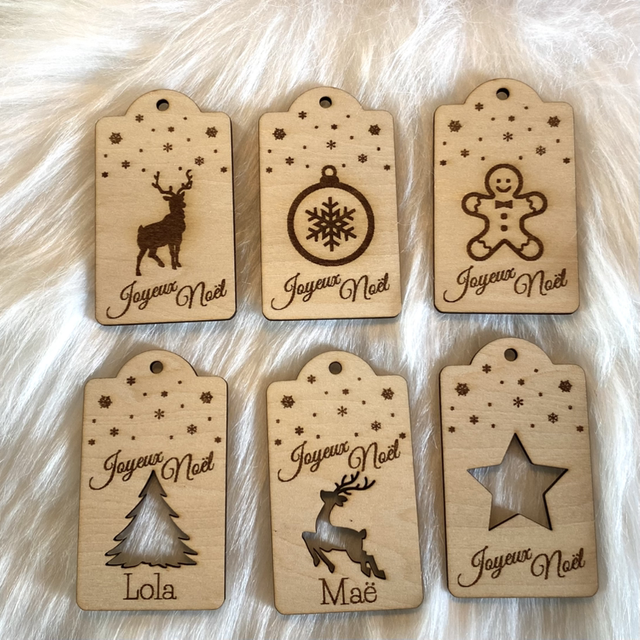 Lot de 6 Étiquettes de Noël en bois gravé personnalisées – Motifs festifs et prénom