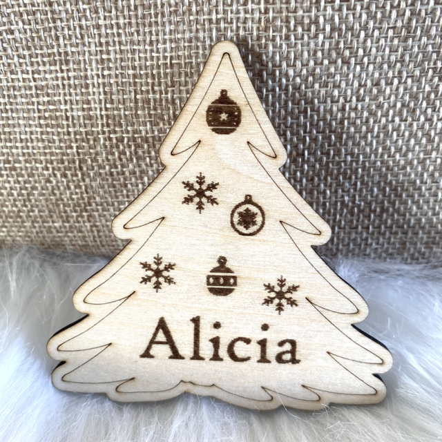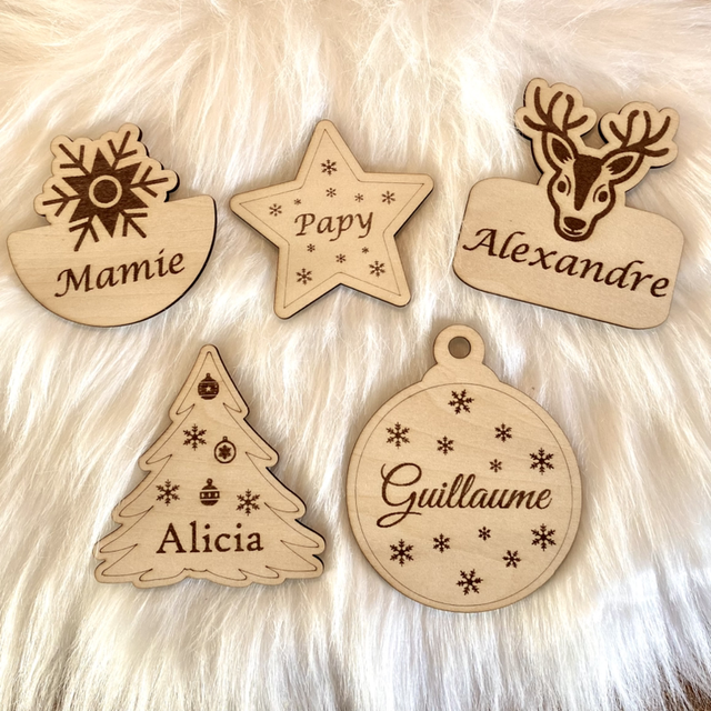 Marque-places en bois personnalisés pour Noël – Motifs festifs et prénoms gravés